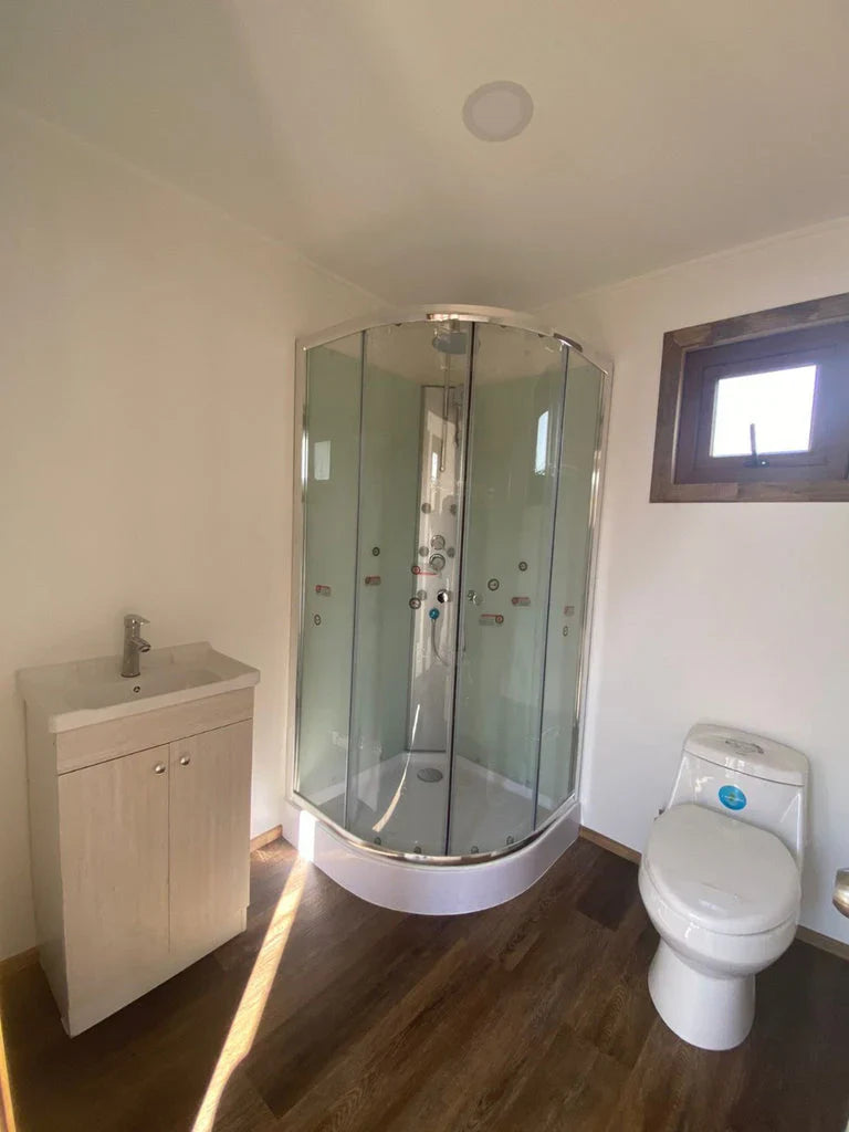 Revestimiento interior osb y volcanita lisa Revestimiento exterior siding fibrocemento Aislación de poliuretano proyectado en cielo Aislación de lana de vidrio en murosPiso pavimento vinílico tipo click
