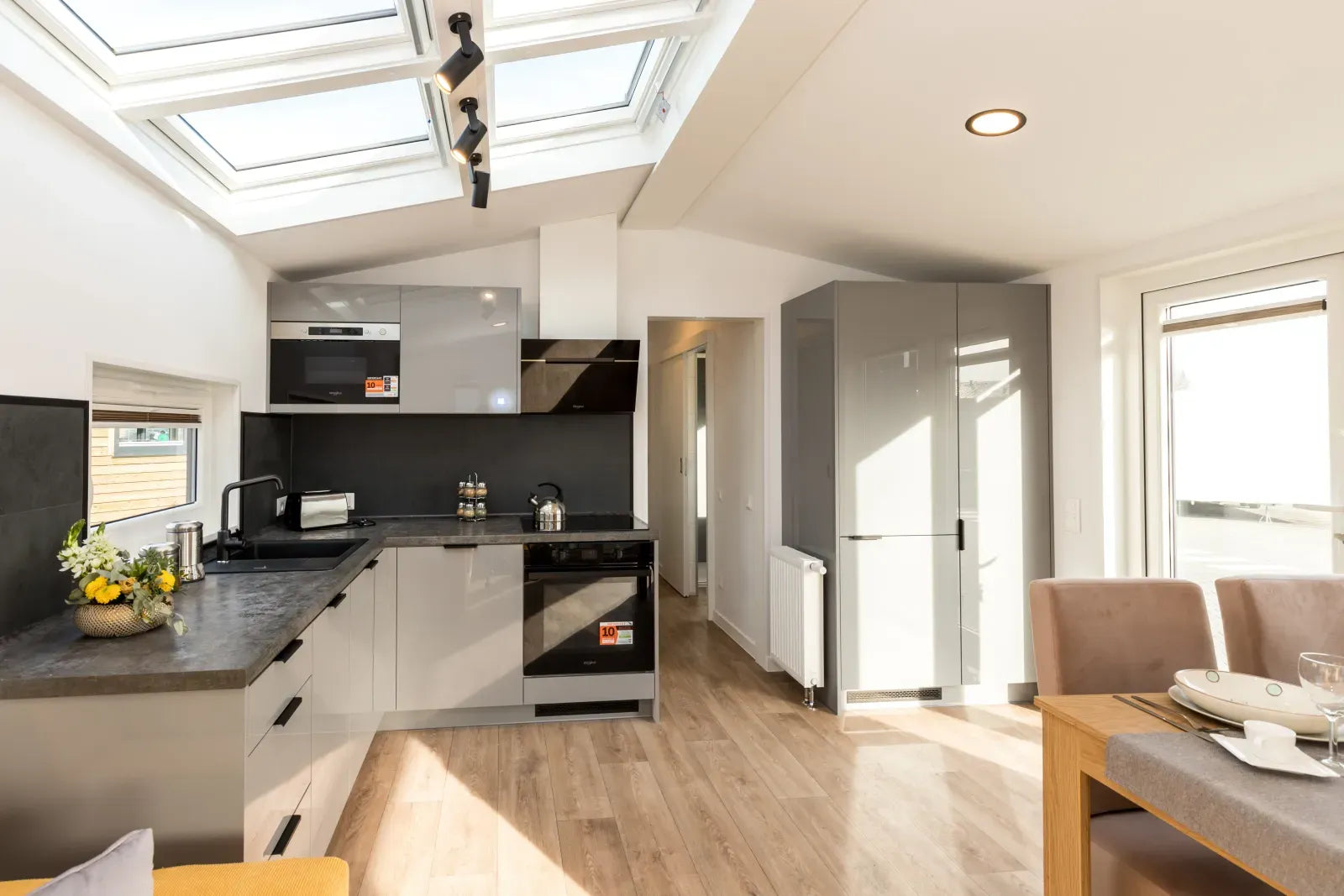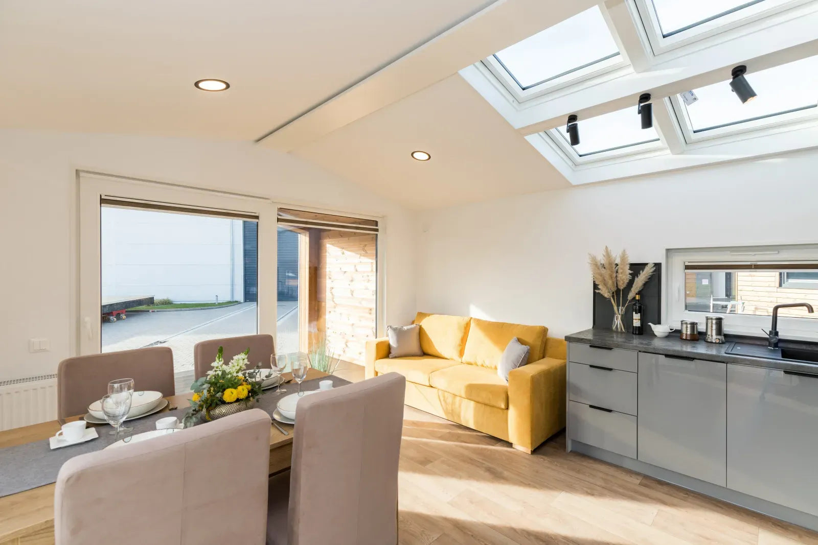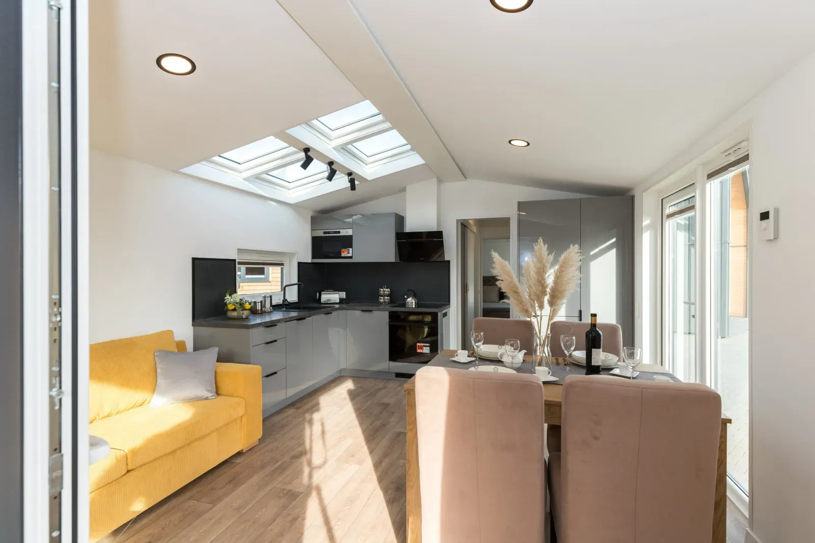 Desde el primer momento, el Capri Luxurior atrae la atención de todos. La fachada moderna y elegante combinada con la exclusiva ventana inclinada que corta el techo hacen de este modelo un auténtico punto de atracción. Se eleva con orgullo por encima de los estándares de la arquitectura de casas pequeñas, ofreciendo una estética incomparable que es a la vez discreta pero poderosa.