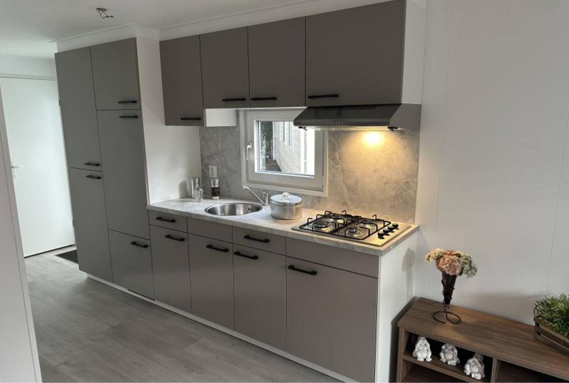 - Cocina completa con, entre otras cosas, un gran frigorífico con congelador, vitrocerámica, fregadero y campana extractora.