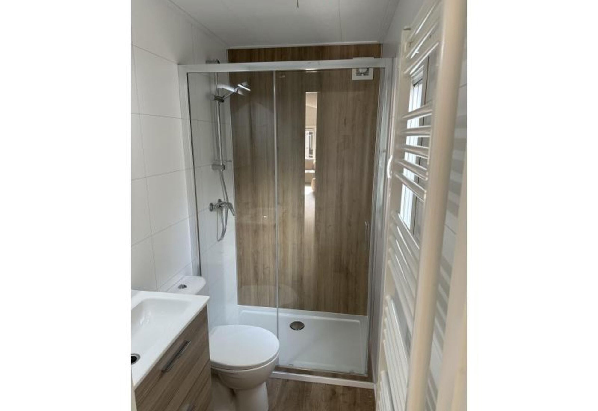 - Baño completo incluyendo paneles de pared Fibo Trespo, ducha de 1,20x0,80, inodoro y mueble de baño de lujo.