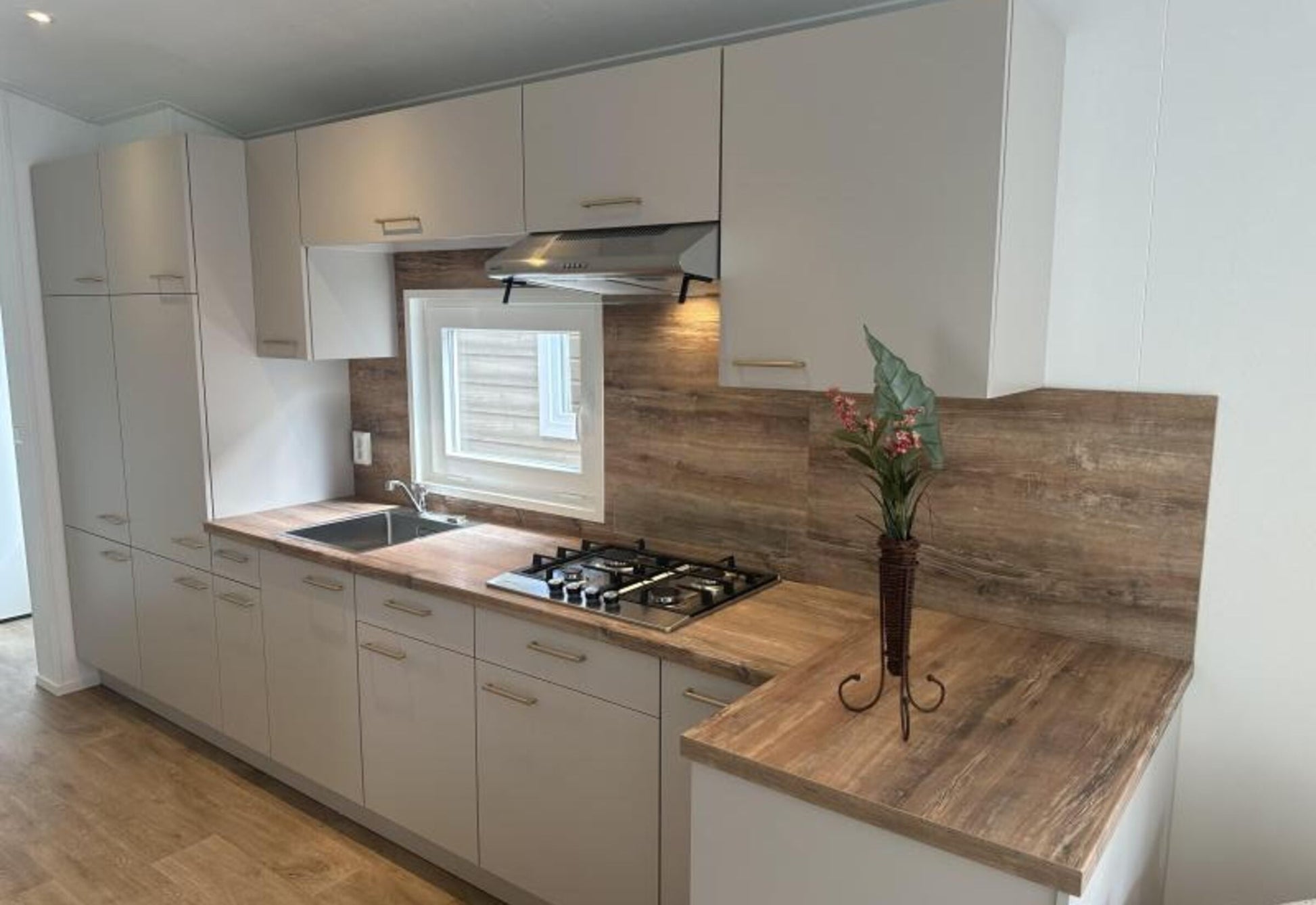 - Cocina completa en forma de L con, entre otras cosas, un gran frigorífico con congelador, vitrocerámica, fregadero y campana extractora.