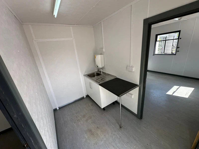 - Cocina americana con lavabo, calentador de agua y encimera.