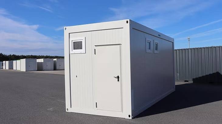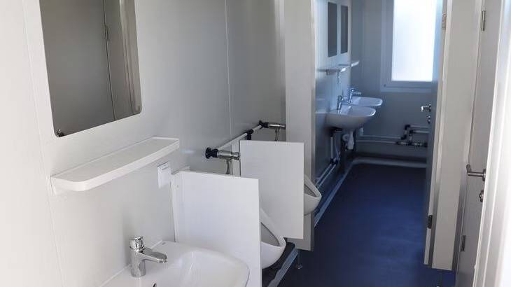 El contenedor incluye dos cabinas de ducha , dos inodoros completos con tanque y portarrollos, y dos urinarios . Además, está equipado con tres lavabos con espejo y estantería , asegurando un espacio amplio y bien equipado. La estructura cuenta con una puerta exterior, ventanas con doble acristalamiento y persiana, y ventanas basculantes para una ventilación óptima.