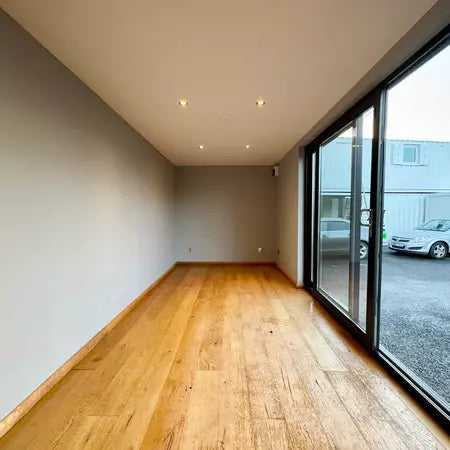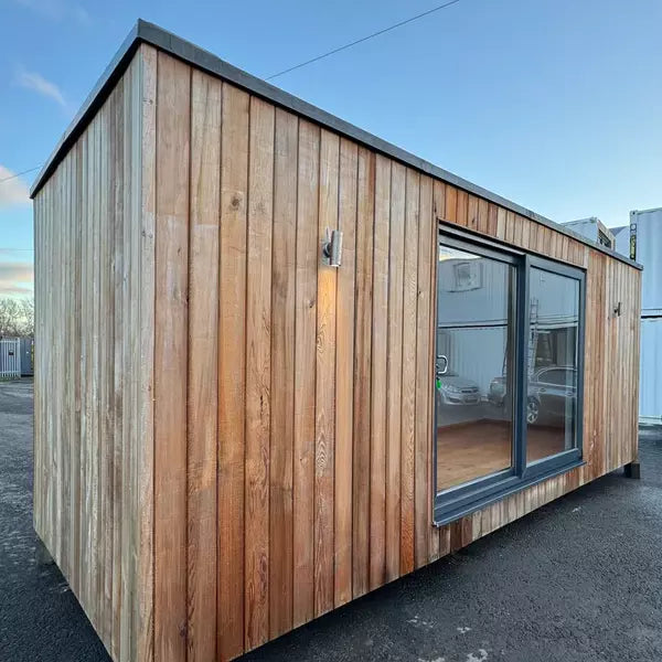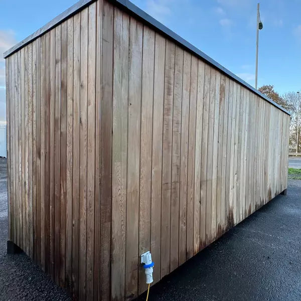 Un contenedor de 20x8 pies completamente reconvertido y aislado, con sistema eléctrico y protector de techo. Toda la unidad está revestida con un revestimiento exterior de madera.