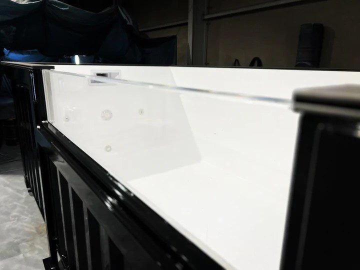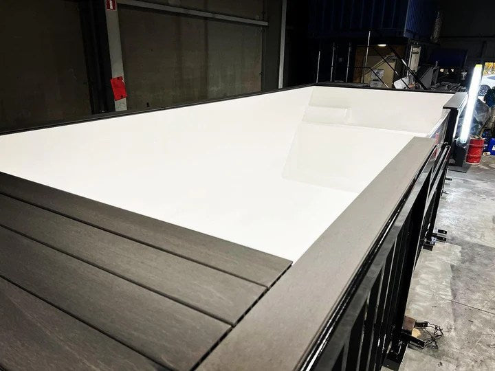 Membrana reforzada Alkorplan 2000 o equivalente Espesor 150/100 10 años de garantía Acabado exterior Tarima y albardilla de madera exótica Opciones de instalación En superficie, se puede acceder a la maquinaria a través de las puertas del contenedor.