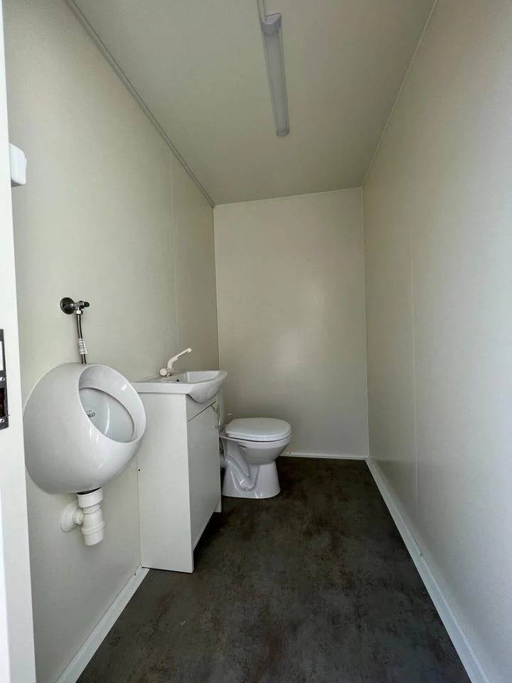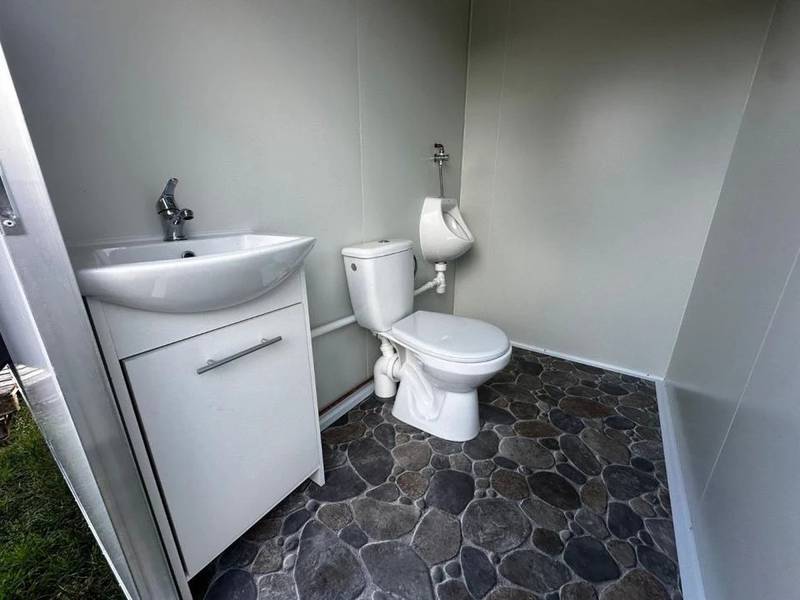 El remolque está dividido en dos compartimentos, para hombres y mujeres . El área de hombres incluye un inodoro, un urinario y un lavabo con mueble, mientras que el de mujeres dispone de un inodoro y un lavabo . La estructura, fabricada con paneles sándwich de 40 mm de espuma, garantiza un excelente aislamiento. Además, cuenta con una instalación eléctrica completa y un convertidor de voltaje para un funcionamiento autónomo.